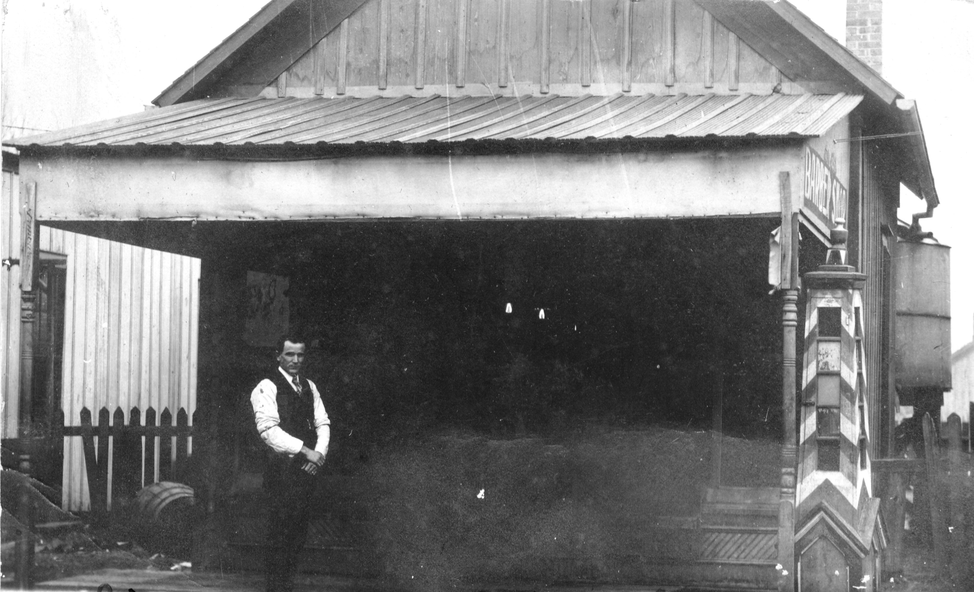 Barber shop, North McAlester, Oklahoma with James Alexander standing in front.