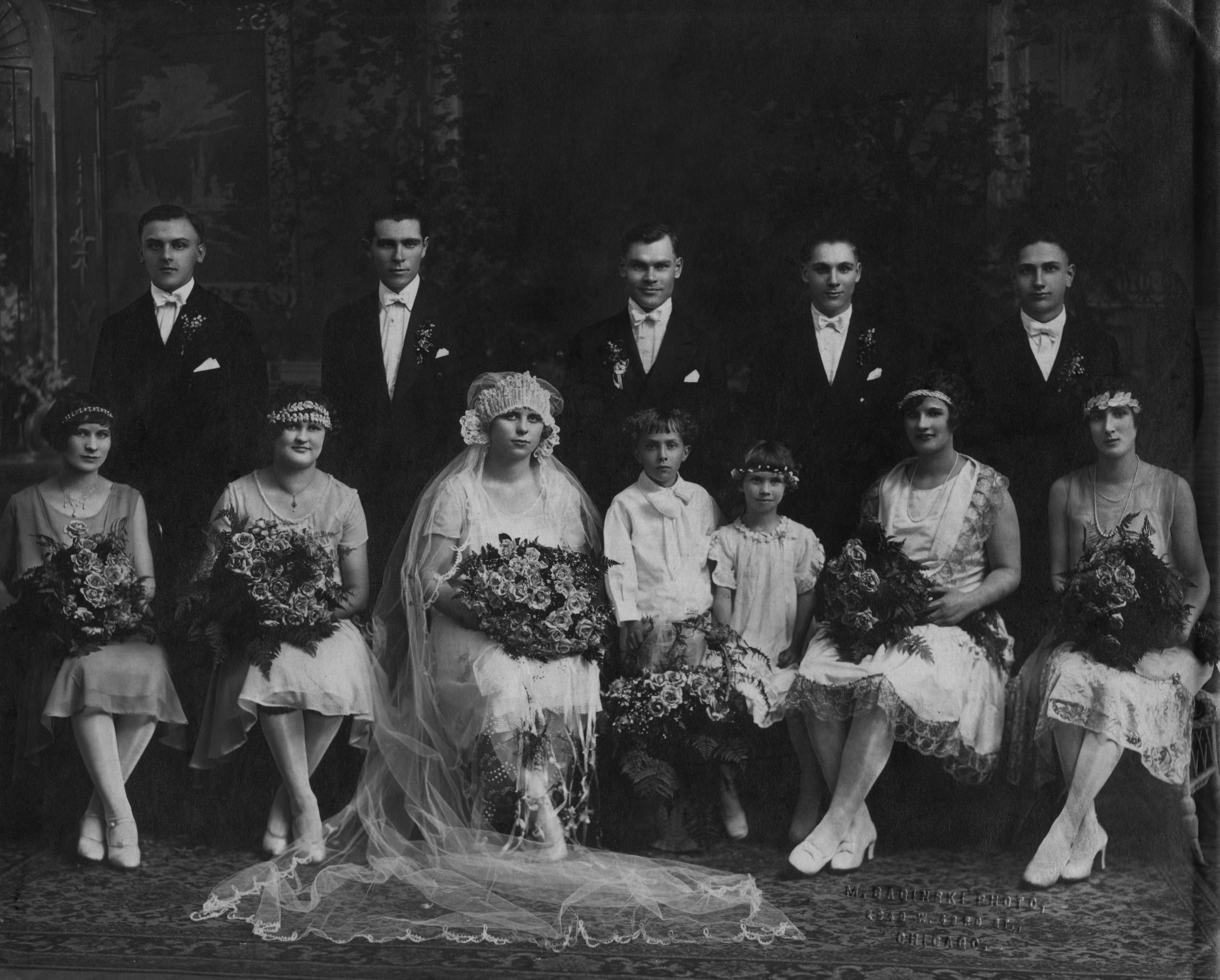 Front row left to right: __, __, Mary (Ludwa) Hajec, __, Sophie Wnuk (the groom's niece, whose married name became Bilek), __, and Vick Michalek (bride's cousin)