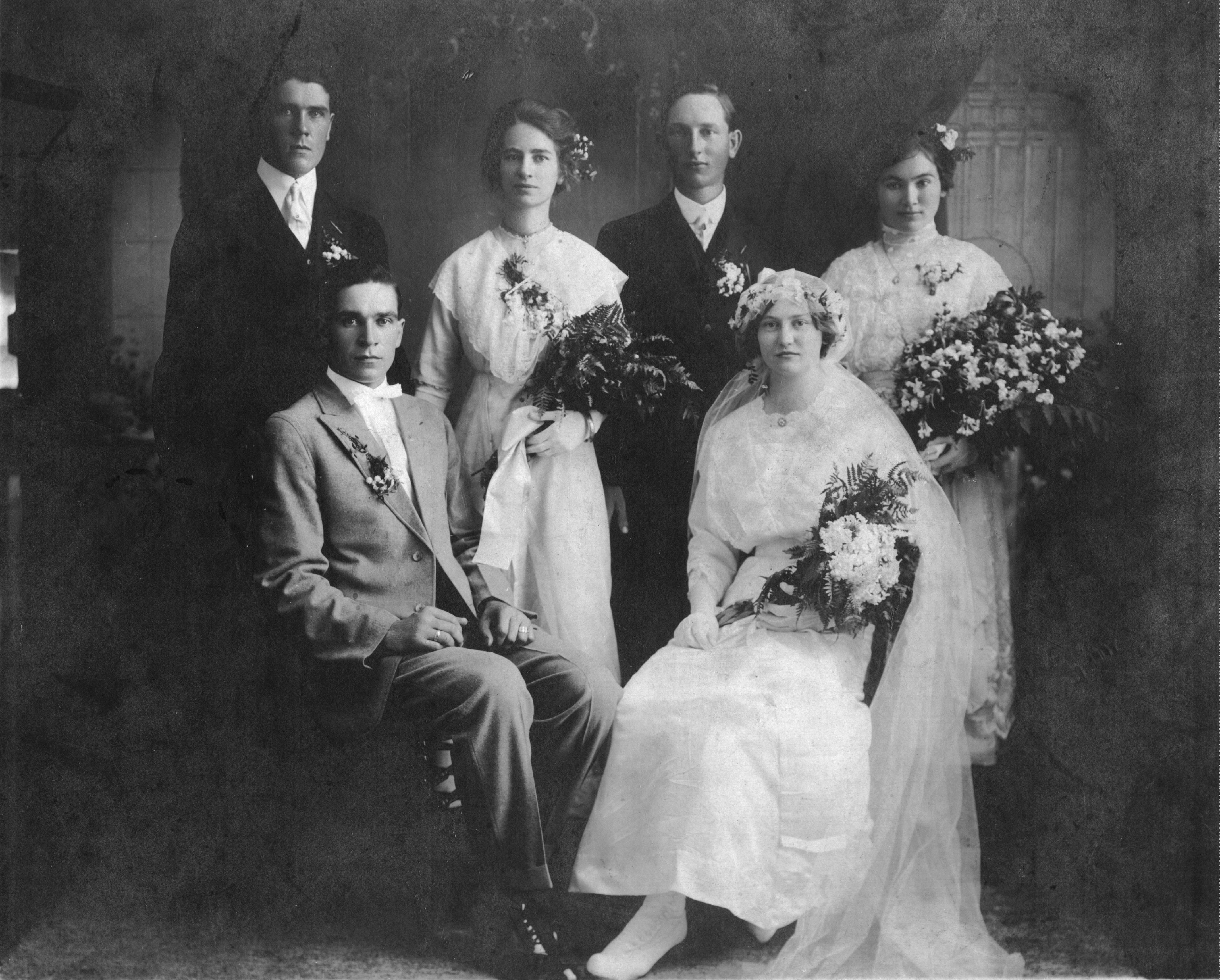 The bride and groom are unknown. Verna Wnuk was a bride's maid (right rear).