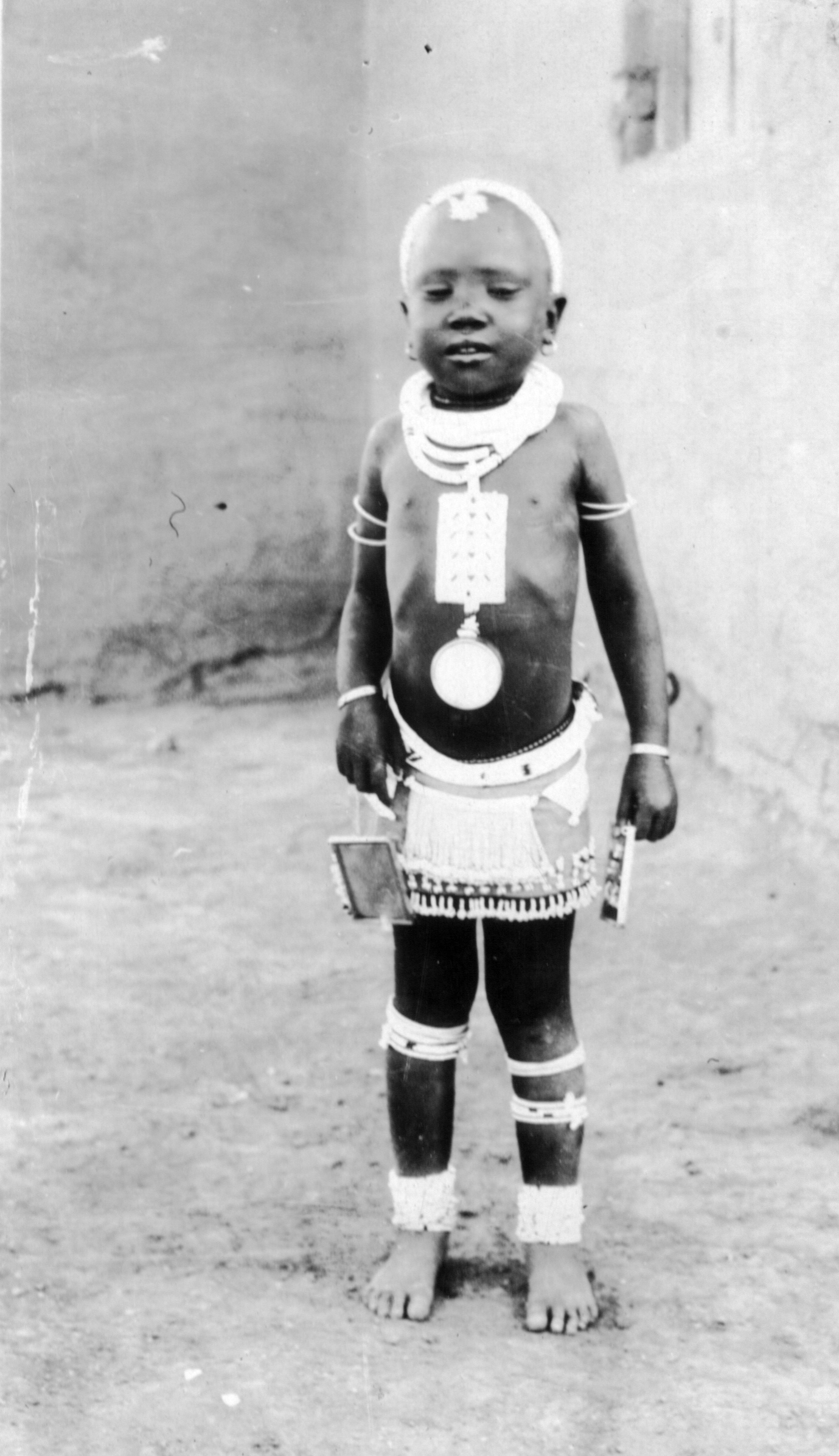 A South African child in an outfit made of beads. This picture was sent by George McIvor to Lenore Alexander early in the twentieth century.